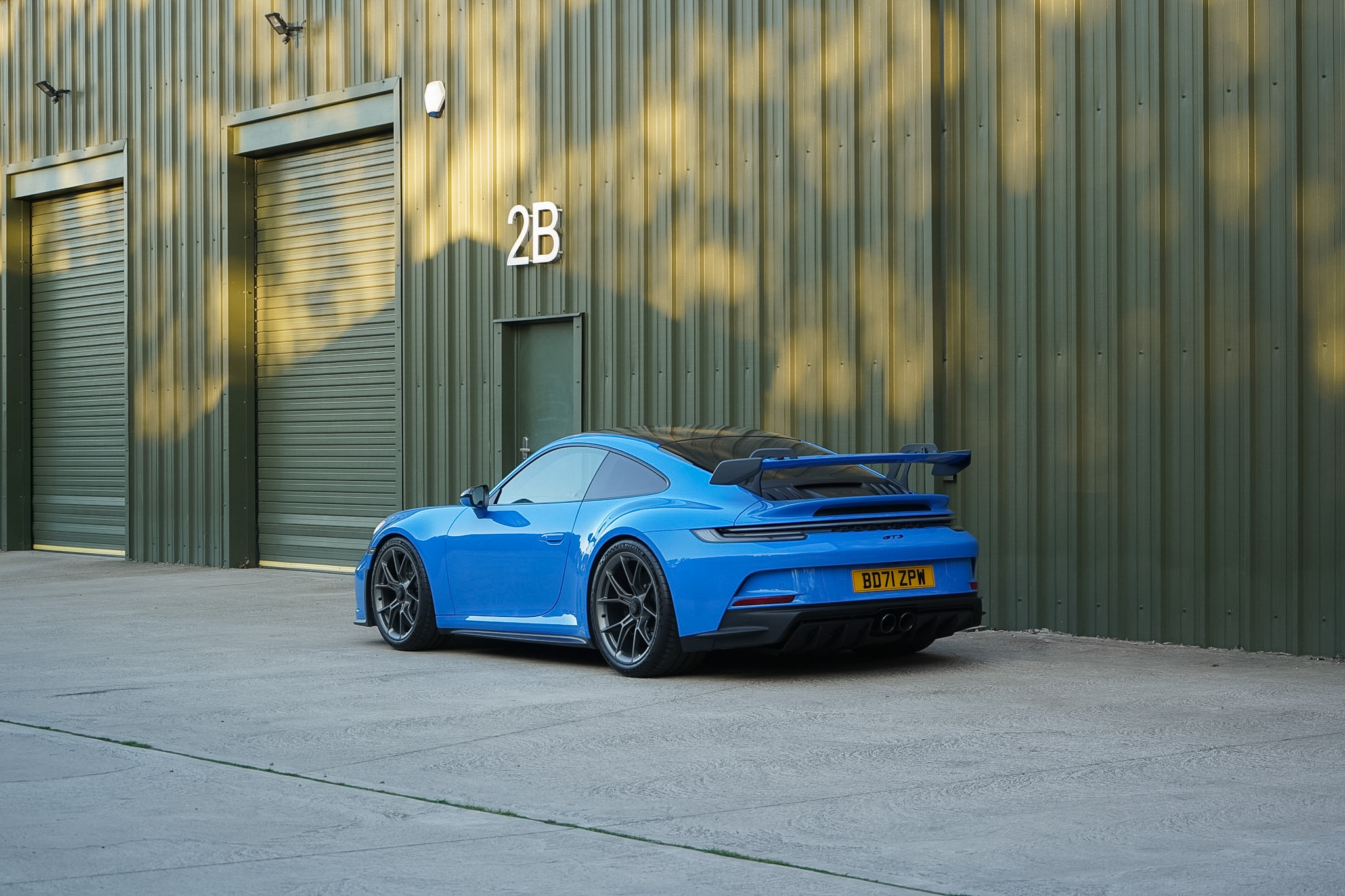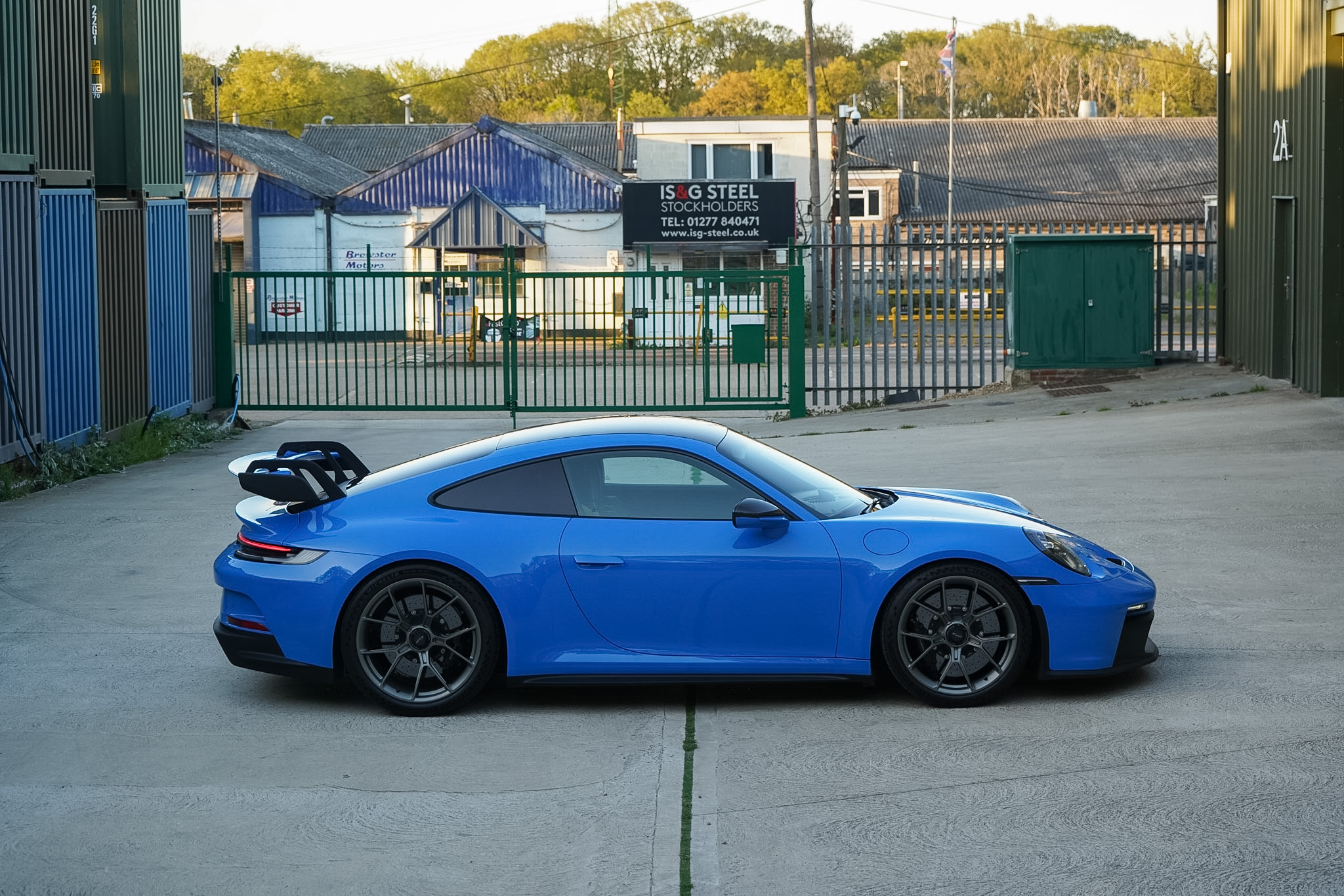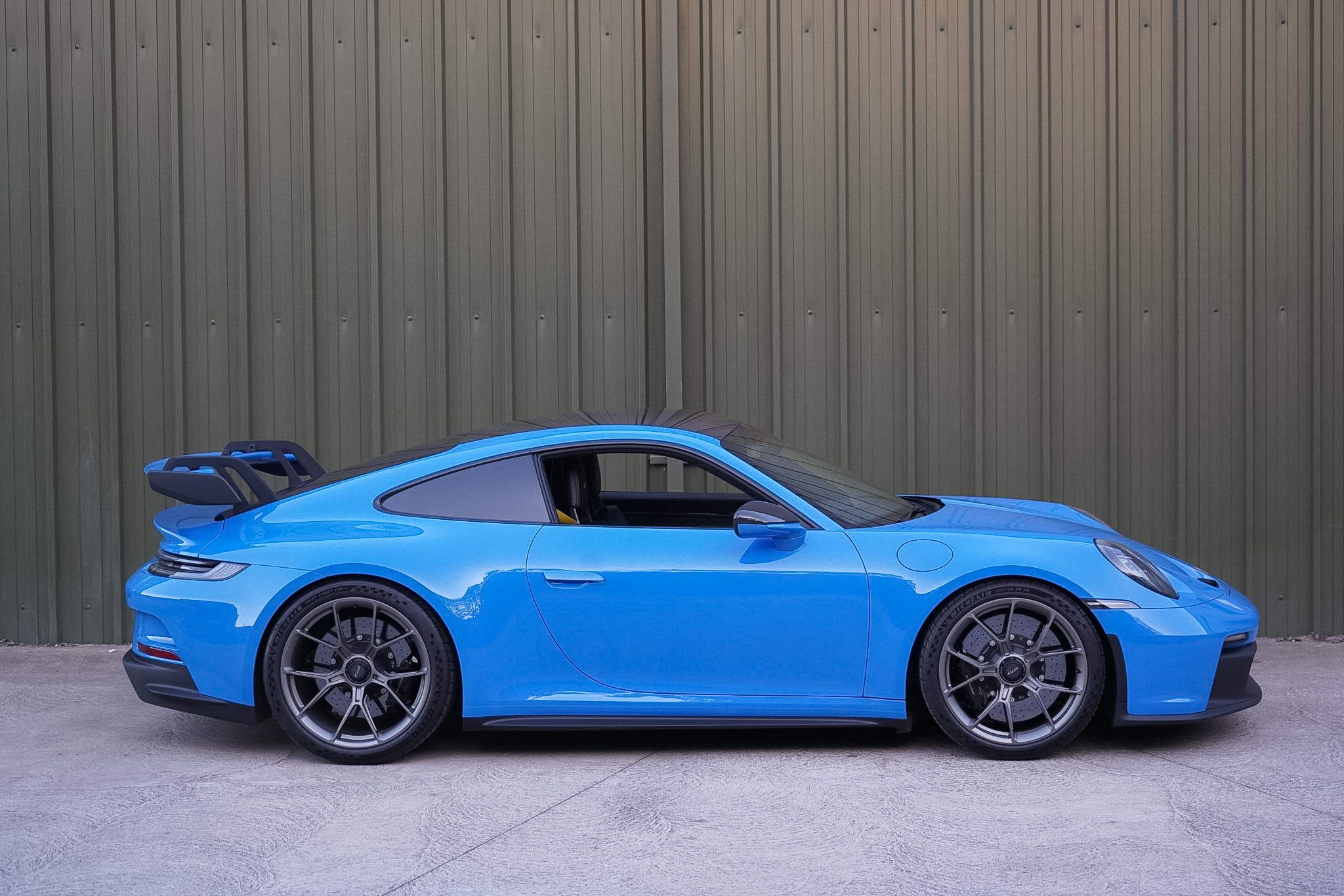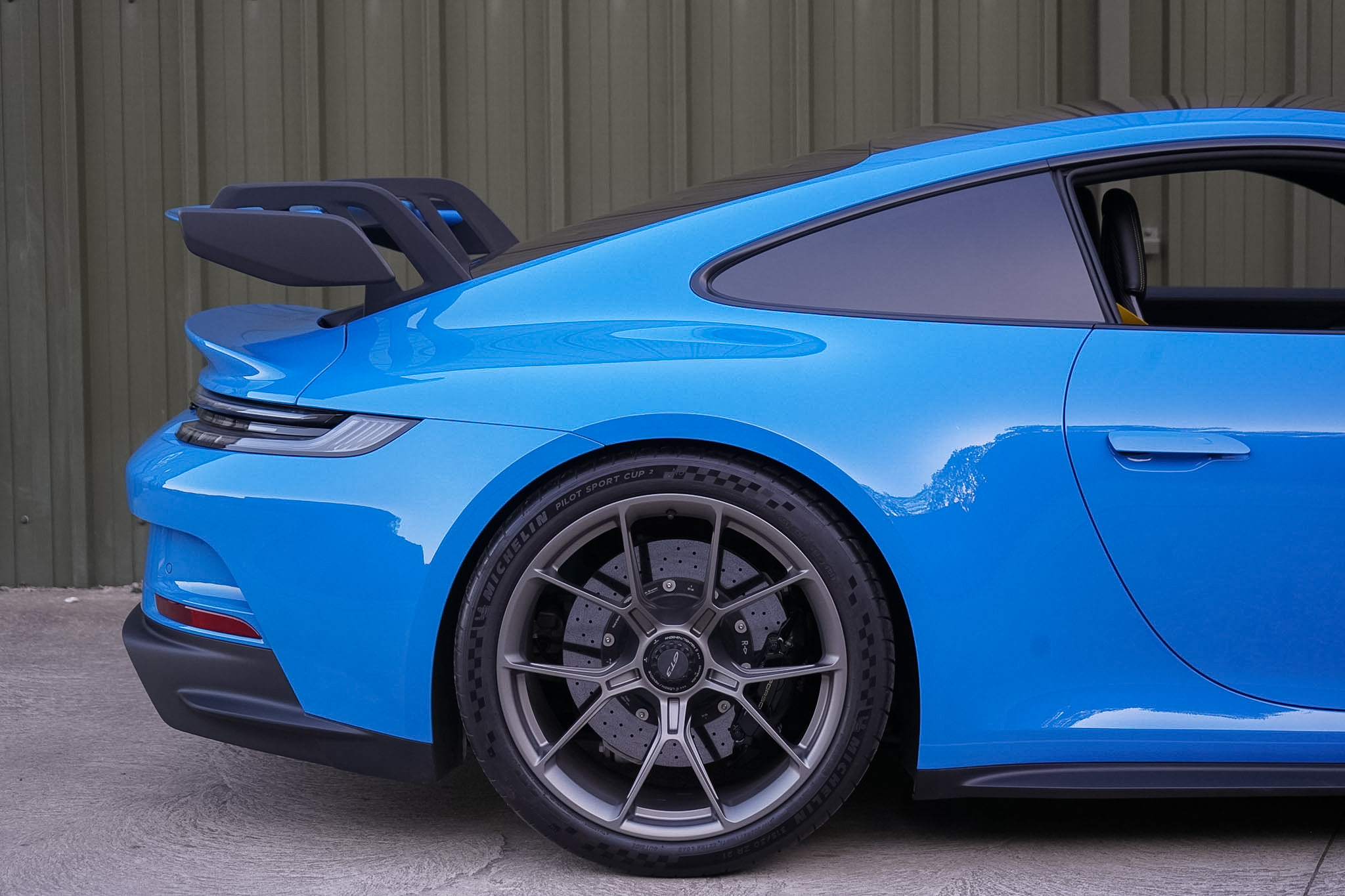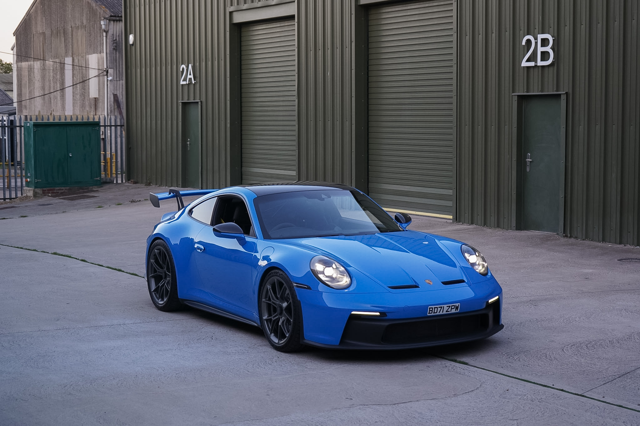 Finished in Launch Colour Shark Blue and specified with everything you'd realistically want from a driver-focused GT3: PCCB, Carbon Buckets, Carbon Roof, Front Axle Lift and Clubsport. It's not missing any of the key options people usually miss out on to stay under the 160-165K mark.