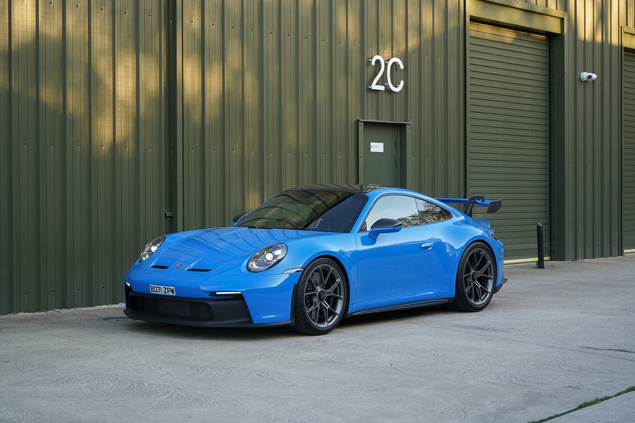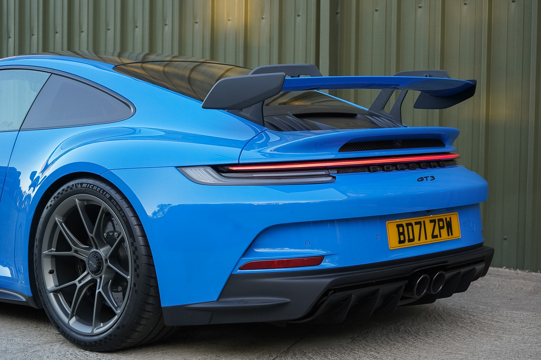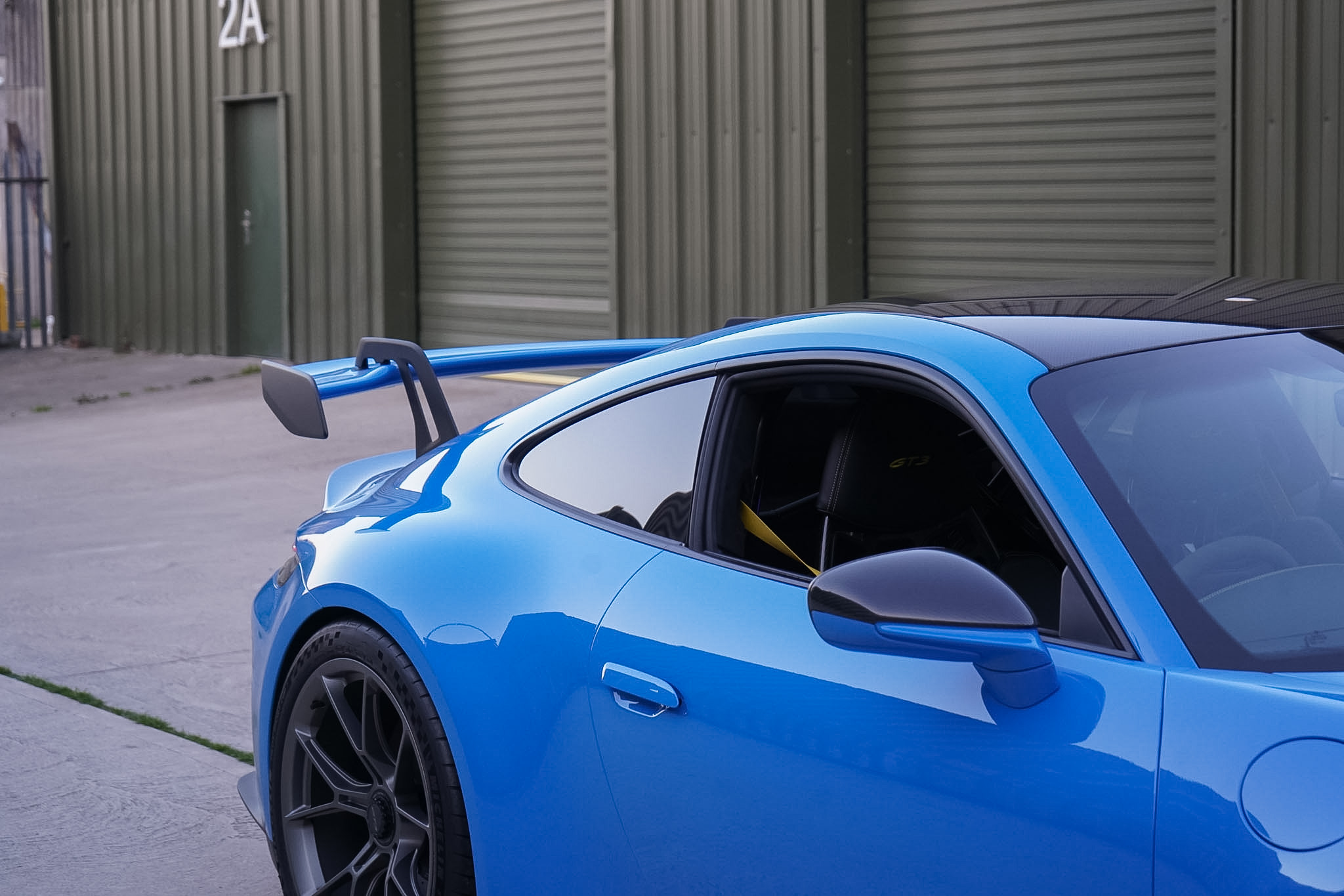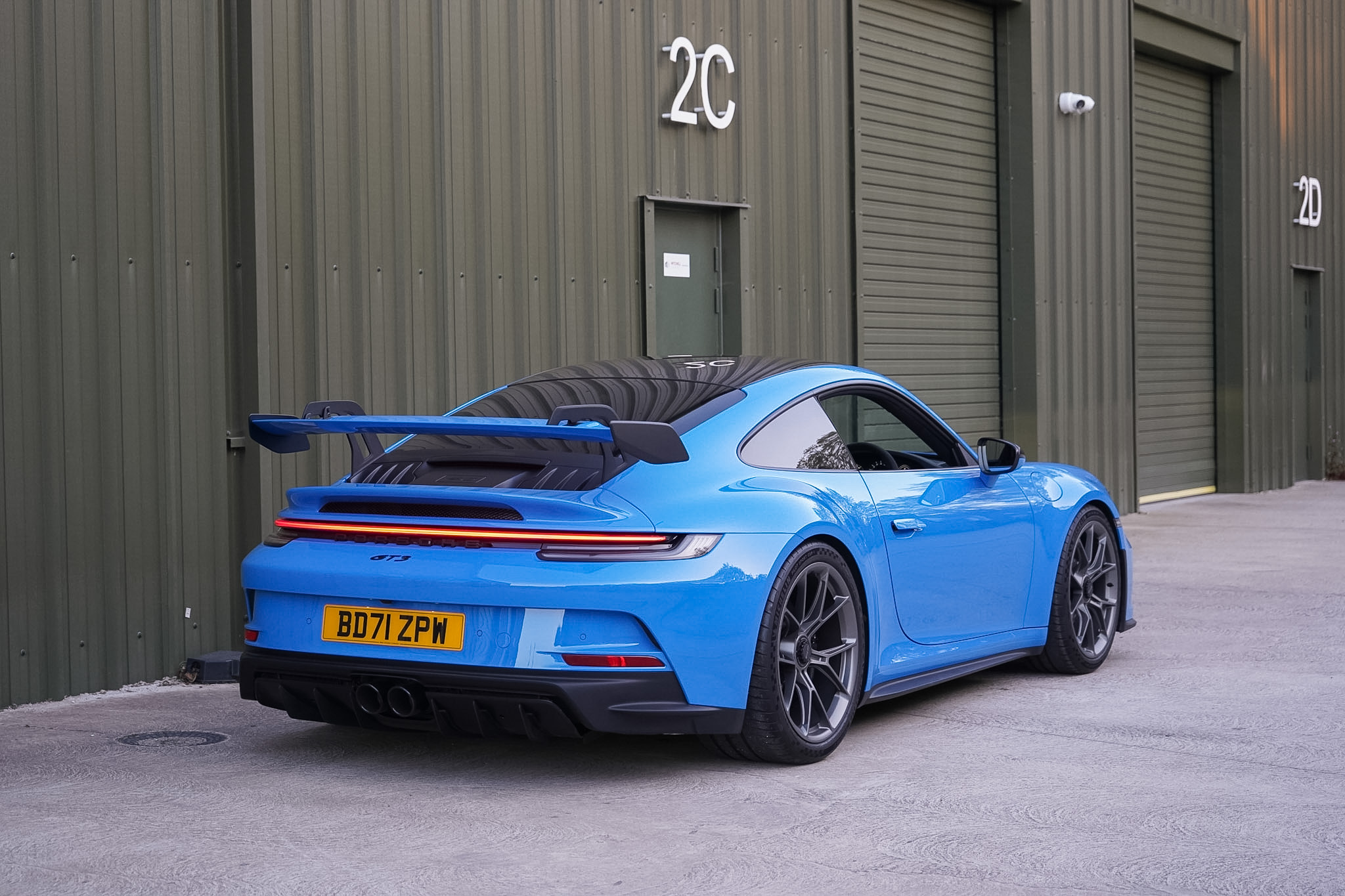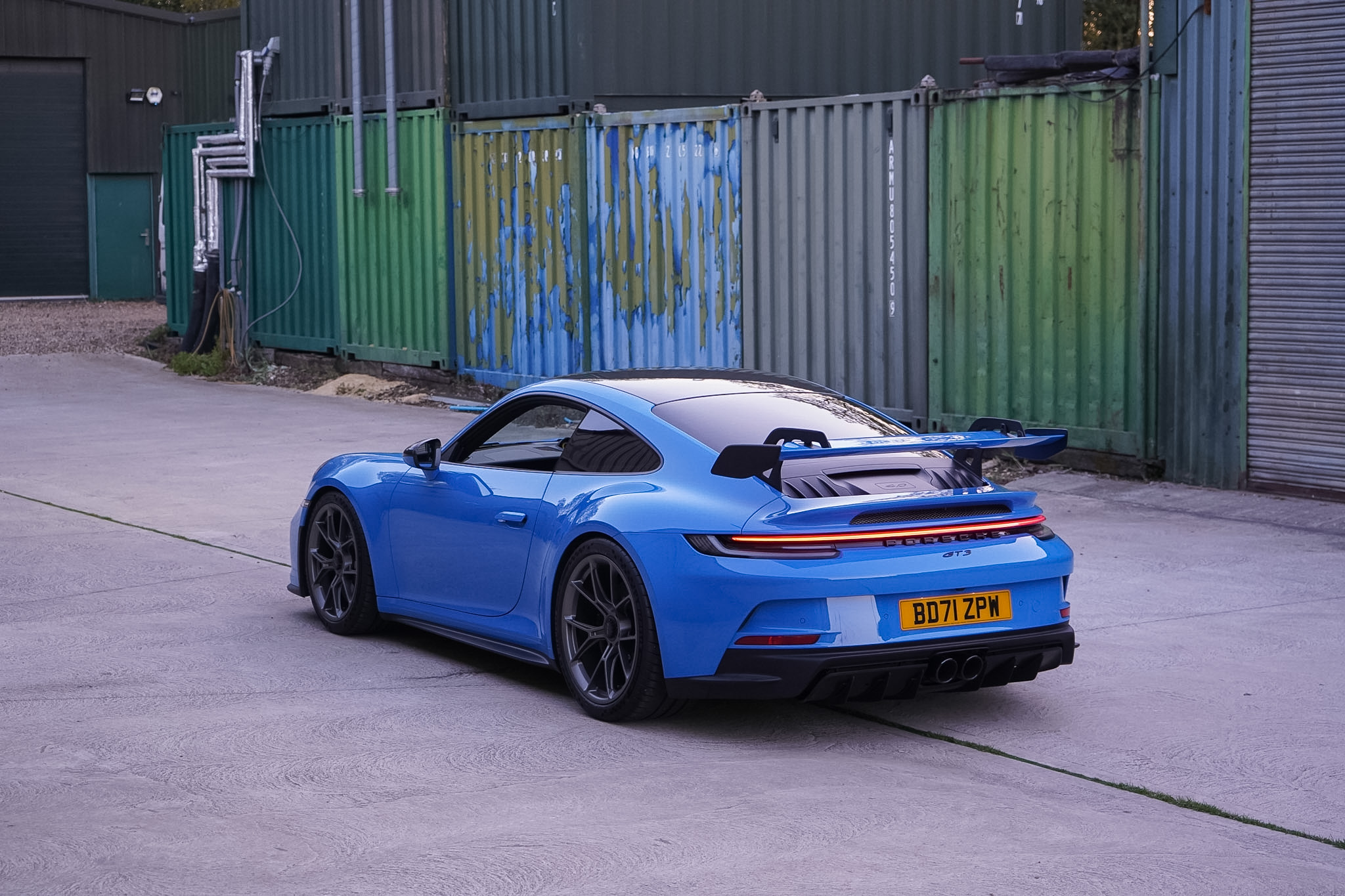 Finished in Launch Colour Shark Blue and specified with everything you'd realistically want from a driver-focused GT3: PCCB, Carbon Buckets, Carbon Roof, Front Axle Lift and Clubsport. It's not missing any of the key options people usually miss out on to stay under the 160-165K mark.